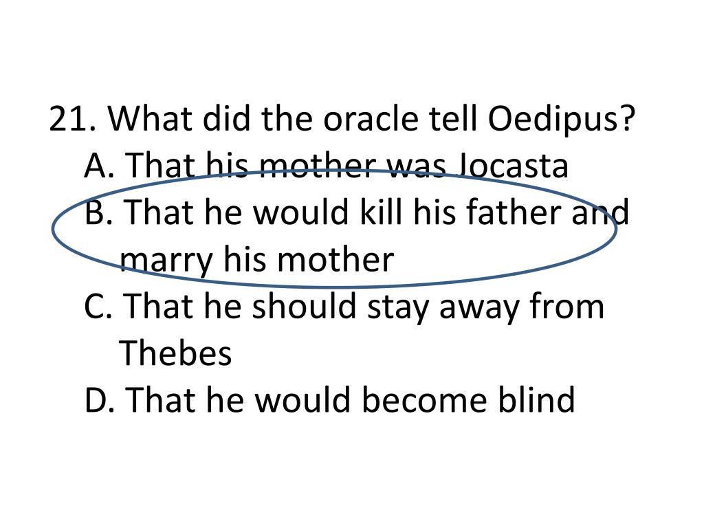 Initially, jocasta attempts to ease oedipus 's mind by explaining to him that the prophecy regarding laius's fate was not fulfilled because he was murdered by three strangers at a place where the. In a way, the oracle telling oedipus that he would kill his father and marry his mother makes the oracles and the gods guilty and not oedipus. Why does jocasta's story about the prophecy that laius received upset oedipus?